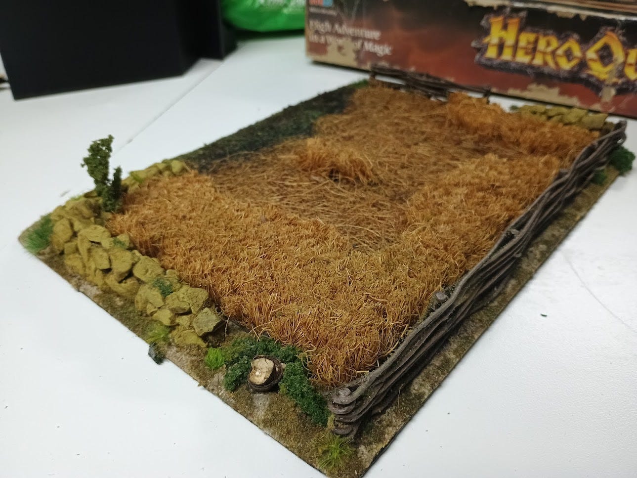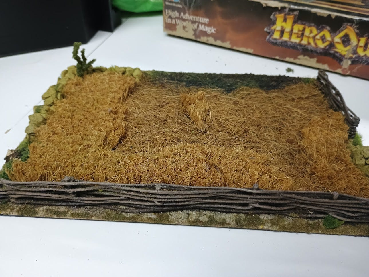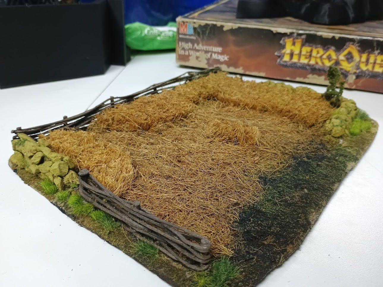 When making wheat fields out of straw welcome mats (which is what this is), I always prefer to cut out sections and replace the gaps with cut down coconut straw to represent trampled or harvested wheat. This adds visual interest and provides a place for miniatures to walk without appearing to be hovering over the tops of the stocks. But what makes this piece better than my previous wheatfields are the combination stone walls and the wattle fence, which I hand-made using techniques presented in PILLAGE, namely wrapping 20-gauge floral wire around skewers. In this case, I used the paper-wrapped floral wire, which I thought produced superior results to the ‘naked’ kind.