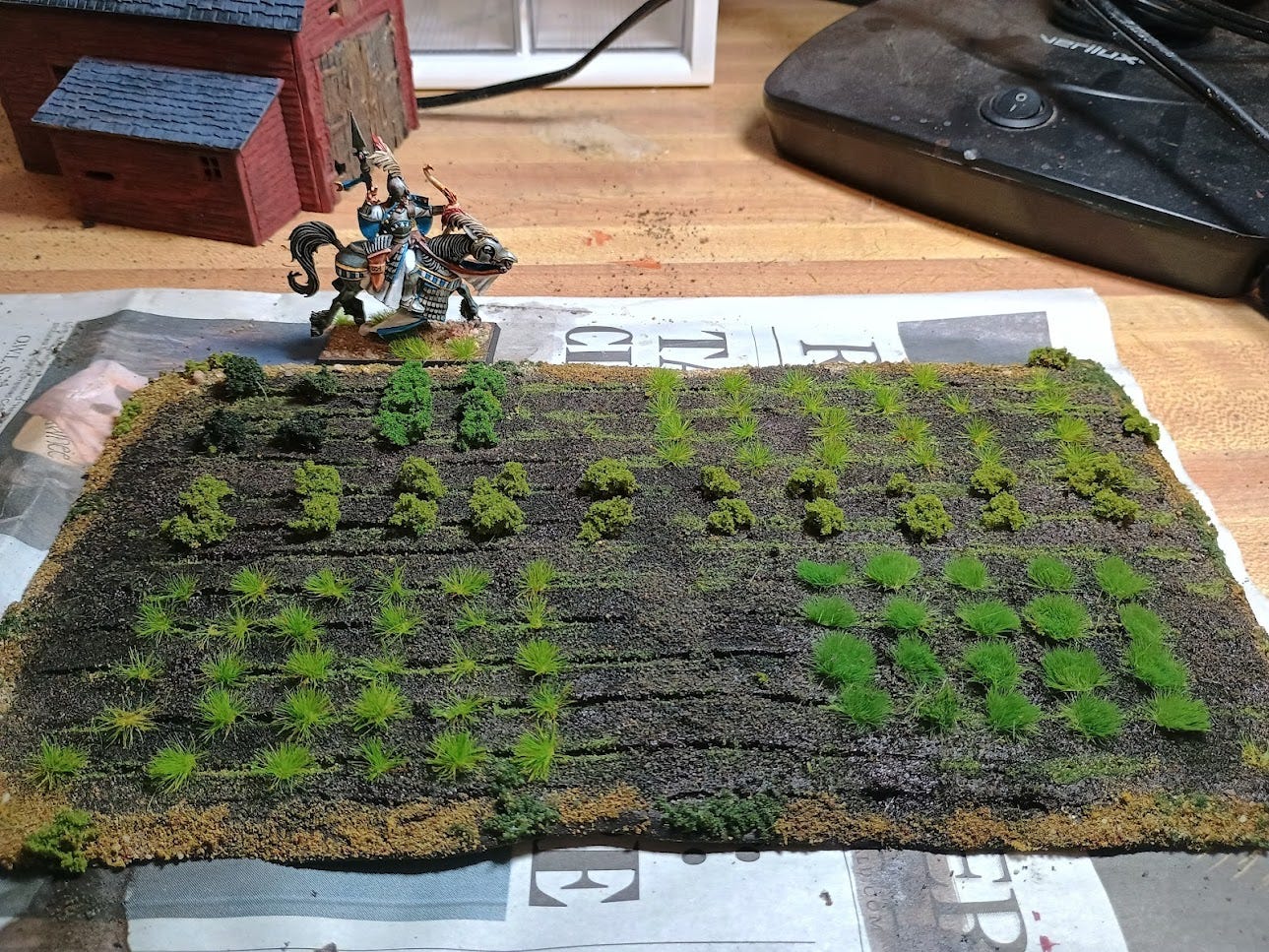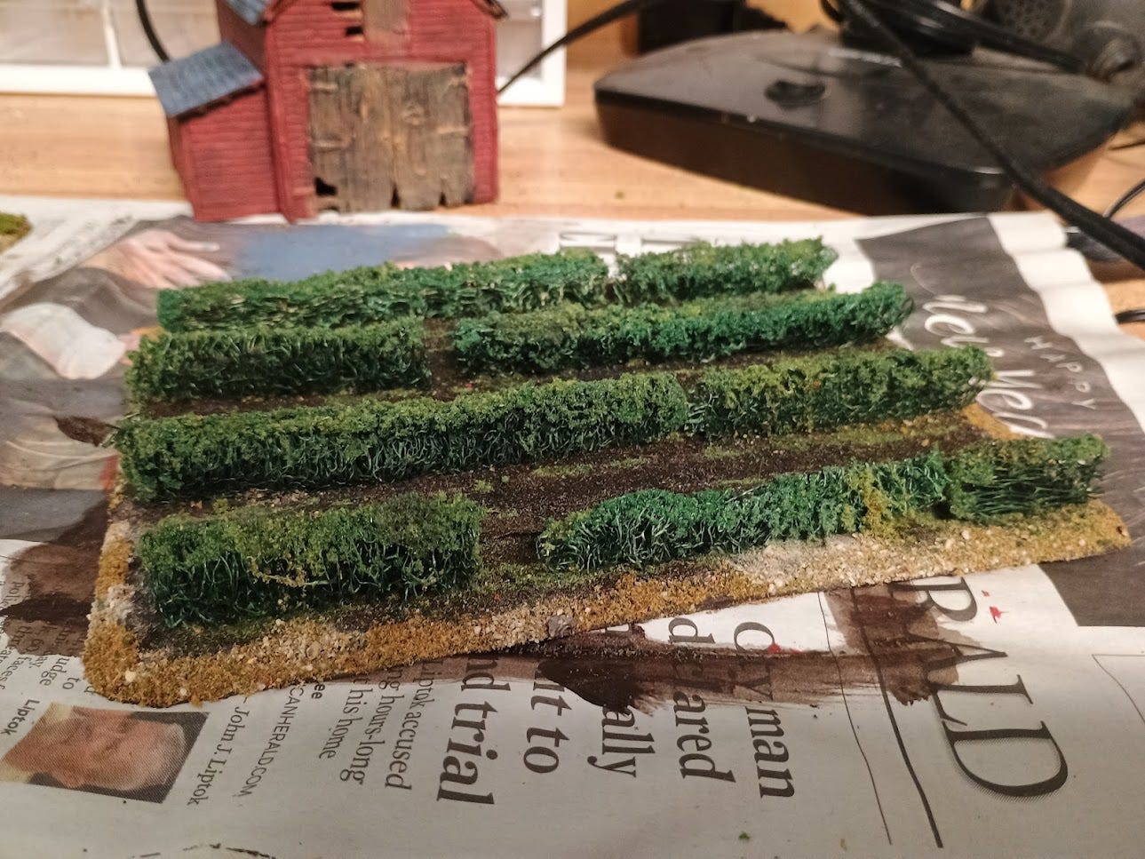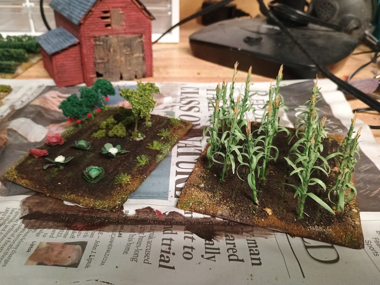 These are not much to write about, just MDF bases covered with spackle with a comb run through them, then painted and flocked. The key to making them look good is to get the placement of the vegetable sprouts right, which I admit took some doing to make it look like a cultivated field rather than a fallow one overgrown with weeds. You may judge for yourself whether I achieved success.
