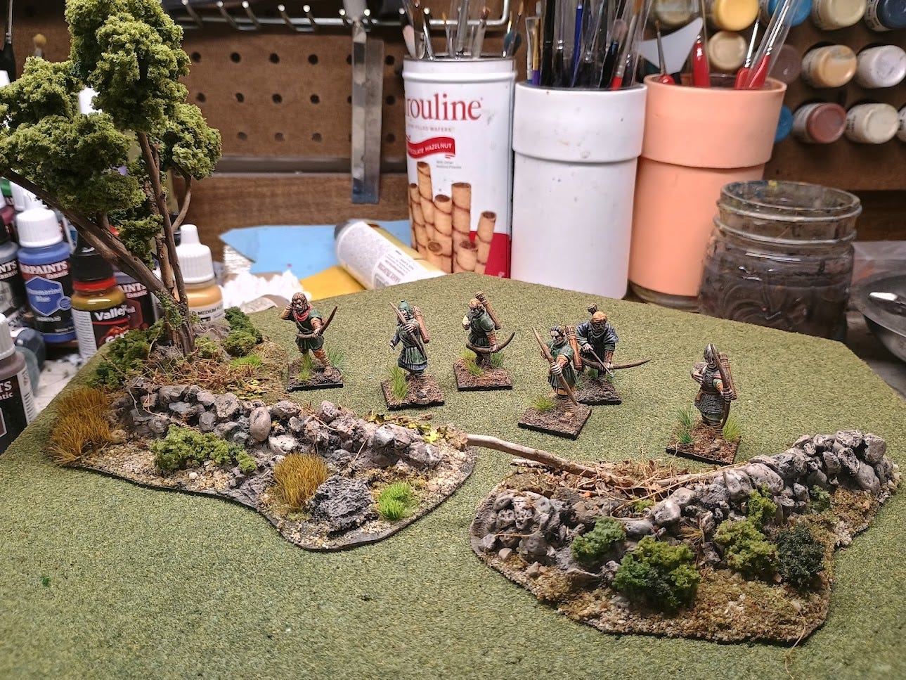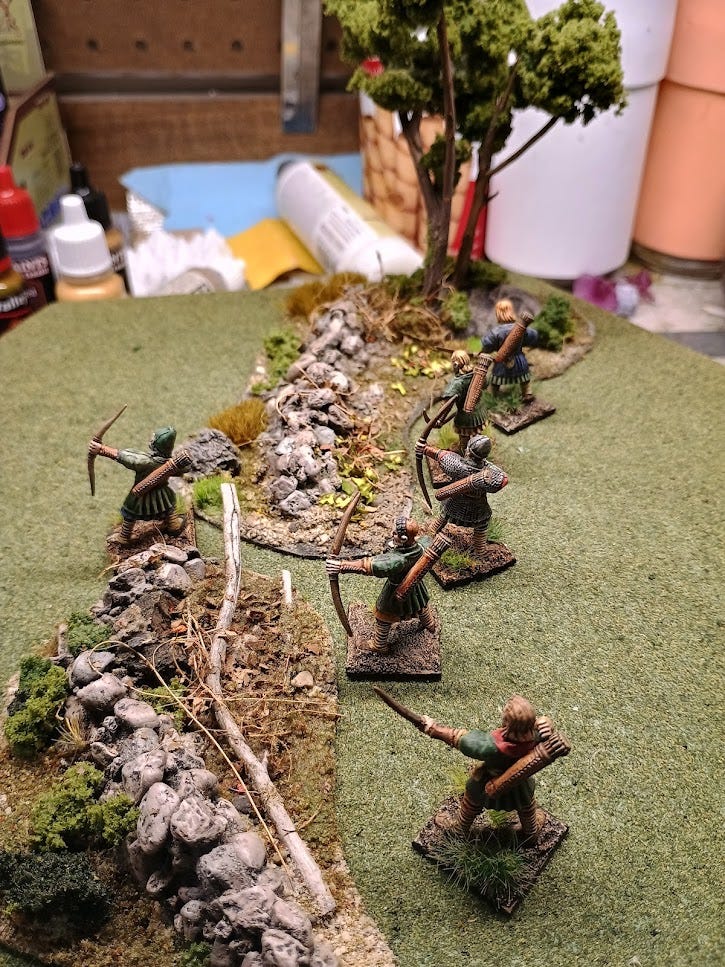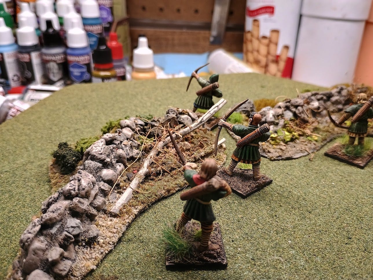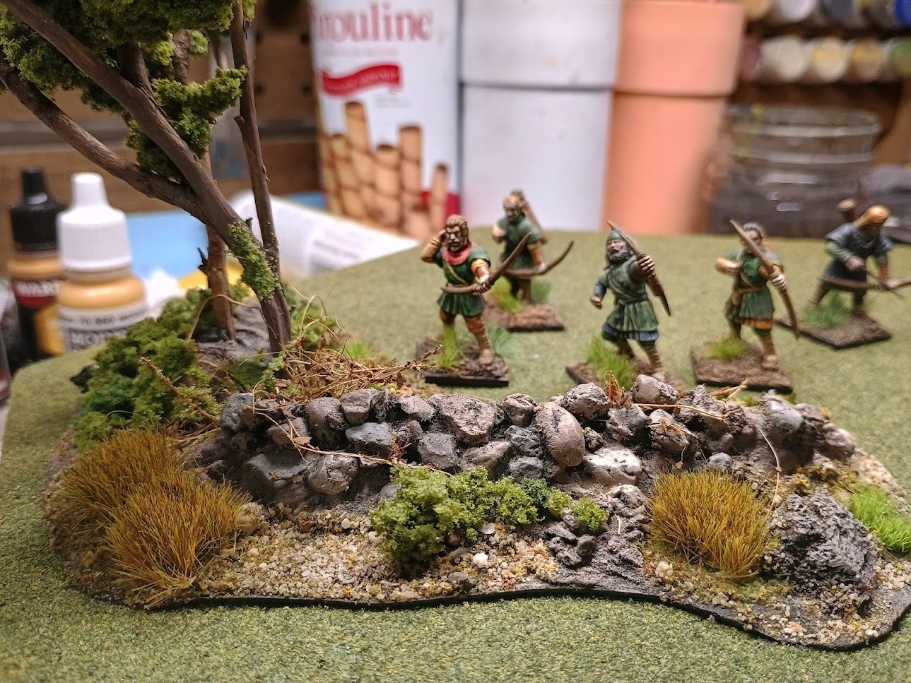 The trees are branches cut from my own hedges and tacky-glued with clump foliage. I think the combination of vegetation looks very natural here, especially when guarded by some outlaws of Sherwood Forest (Medieval Archers miniatures by Conquest Games).