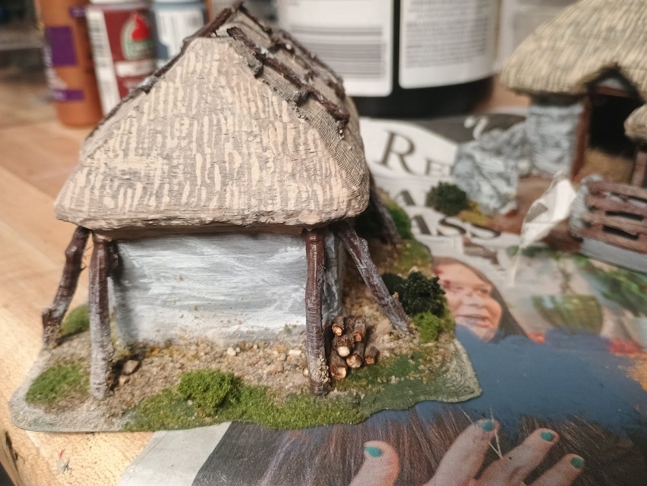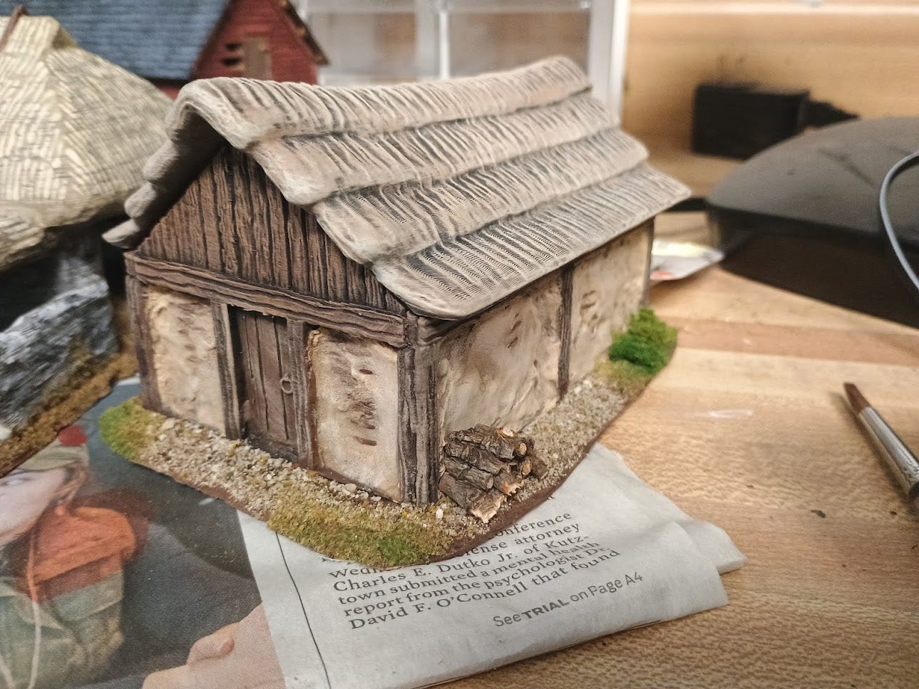 These are 3D prints, the first of which I printed myself and covered up most of the wattle with some spackle for the slightly deteriorated effect, the other two I purchased already painted some years ago at Historicon, but needed a better basing job. While basing buildings limits their usability somewhat, I find that they appear to be ‘floating’ on the battlefield without one, unless you do a bit of work with lichen or appropriate ground clutter around the edges to blend them in. I really think the base work on these is some of my best, especially after I added some shrubberies and piles of chopped wood to complete the effect.