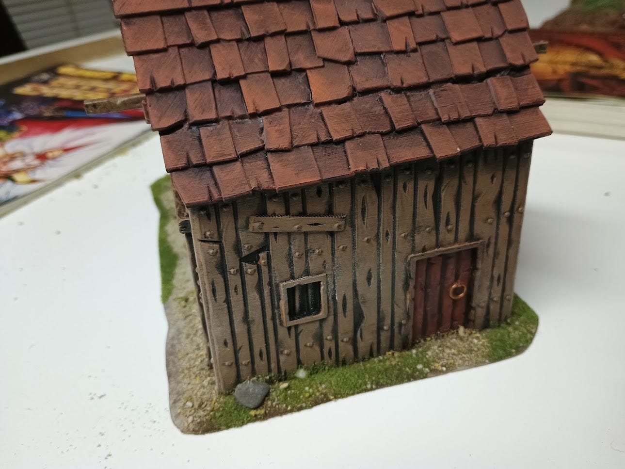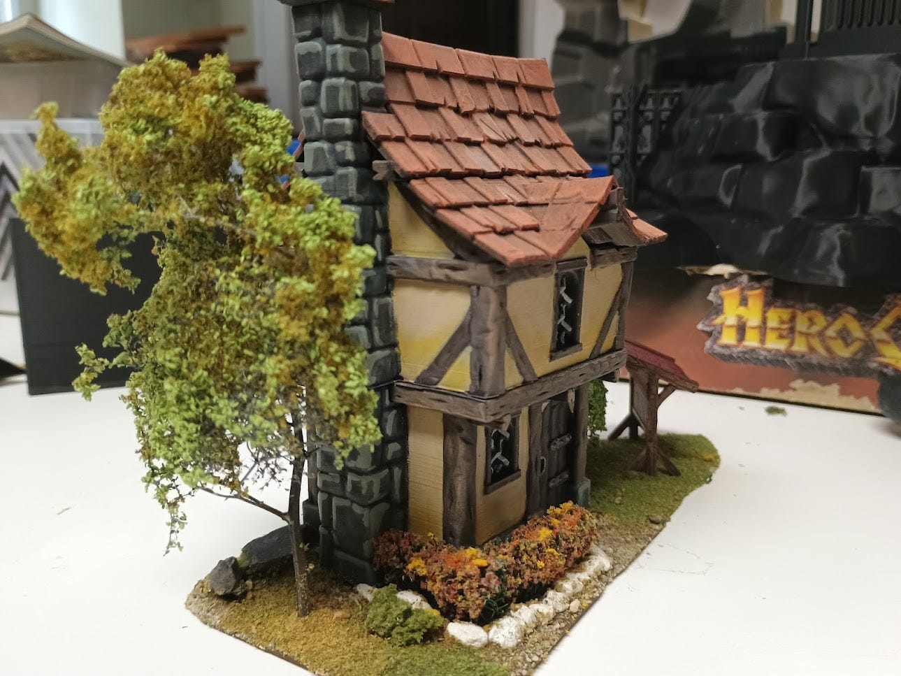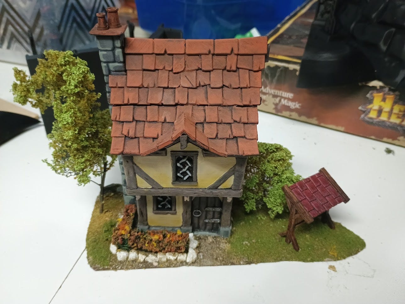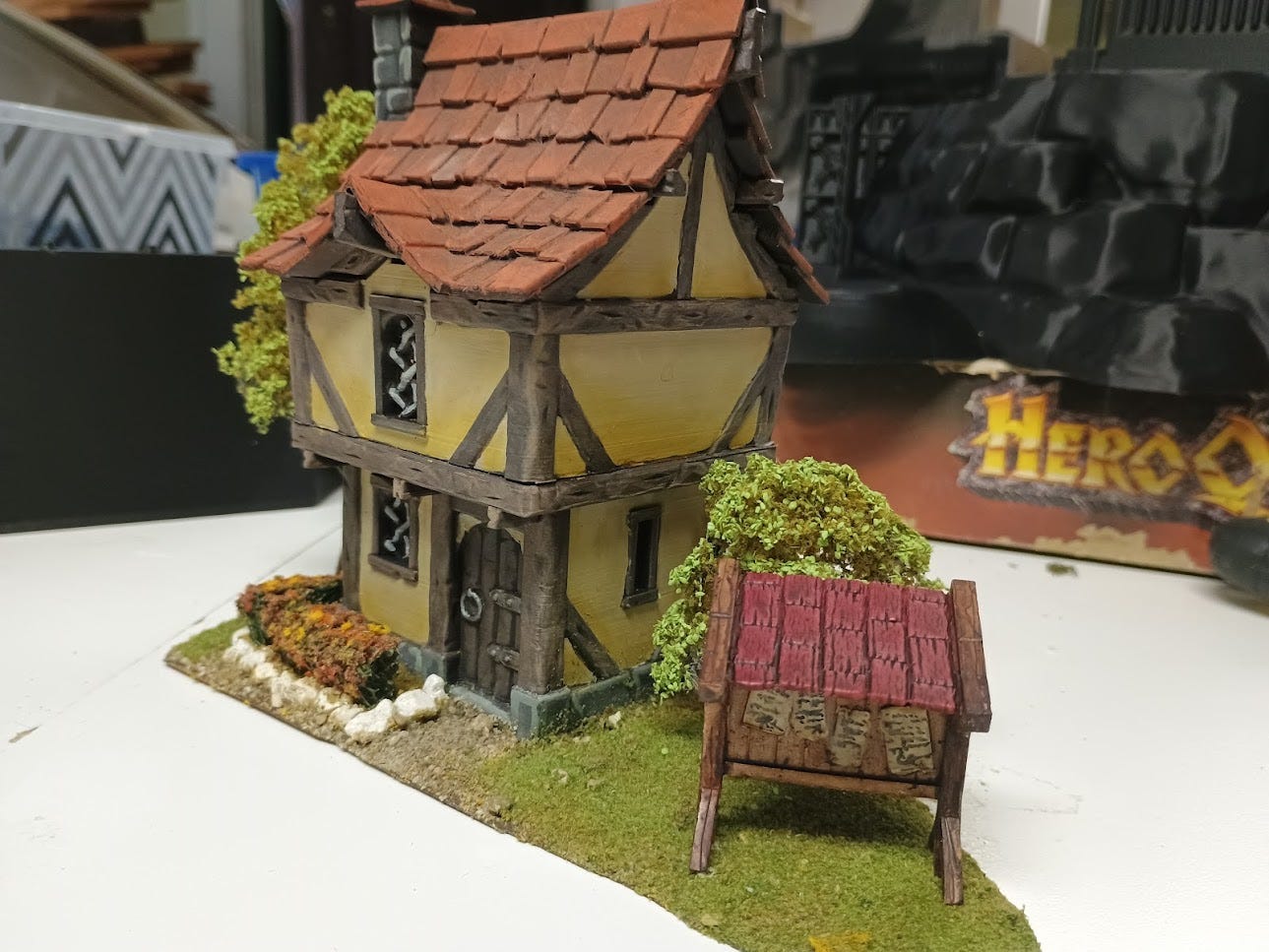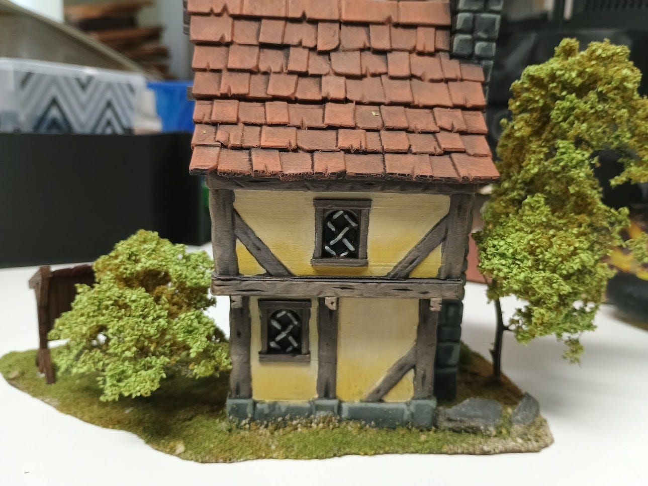 And finally we have this tidy little two story timber-frame house. It’s rather small for a home, so in my imagination it’s a toll house to be placed near bridges or turnpikes. The ‘quest board’ was a 3D print from MakerMan3d and made the trees out of seafoam and a combination of flock from Nock and Bachmann coarse ground cover.