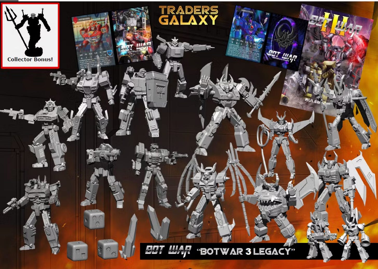This month for Bot War you get 15 different models, all the dice and the rulebook for the low price of $10 USD and for RoTD you get 11 human sized models, and tank and a giant Robot.